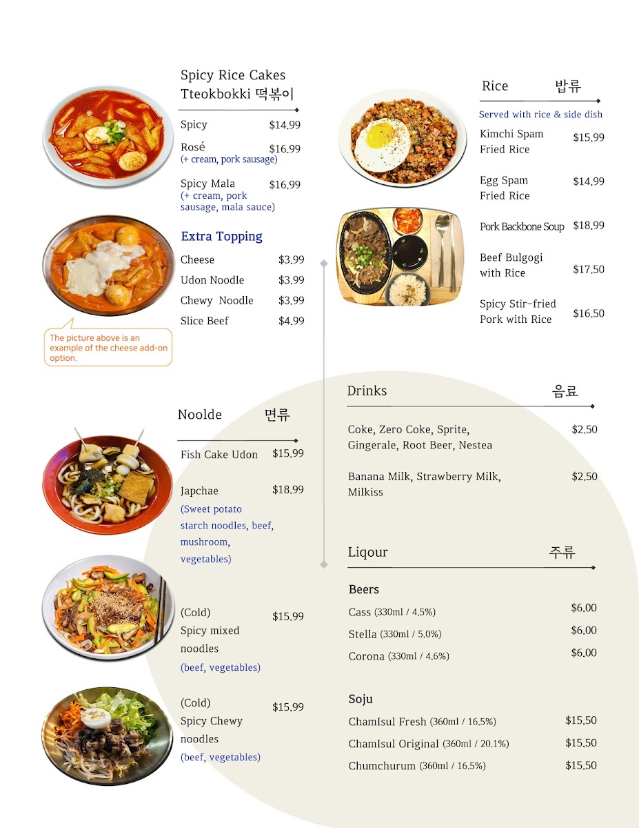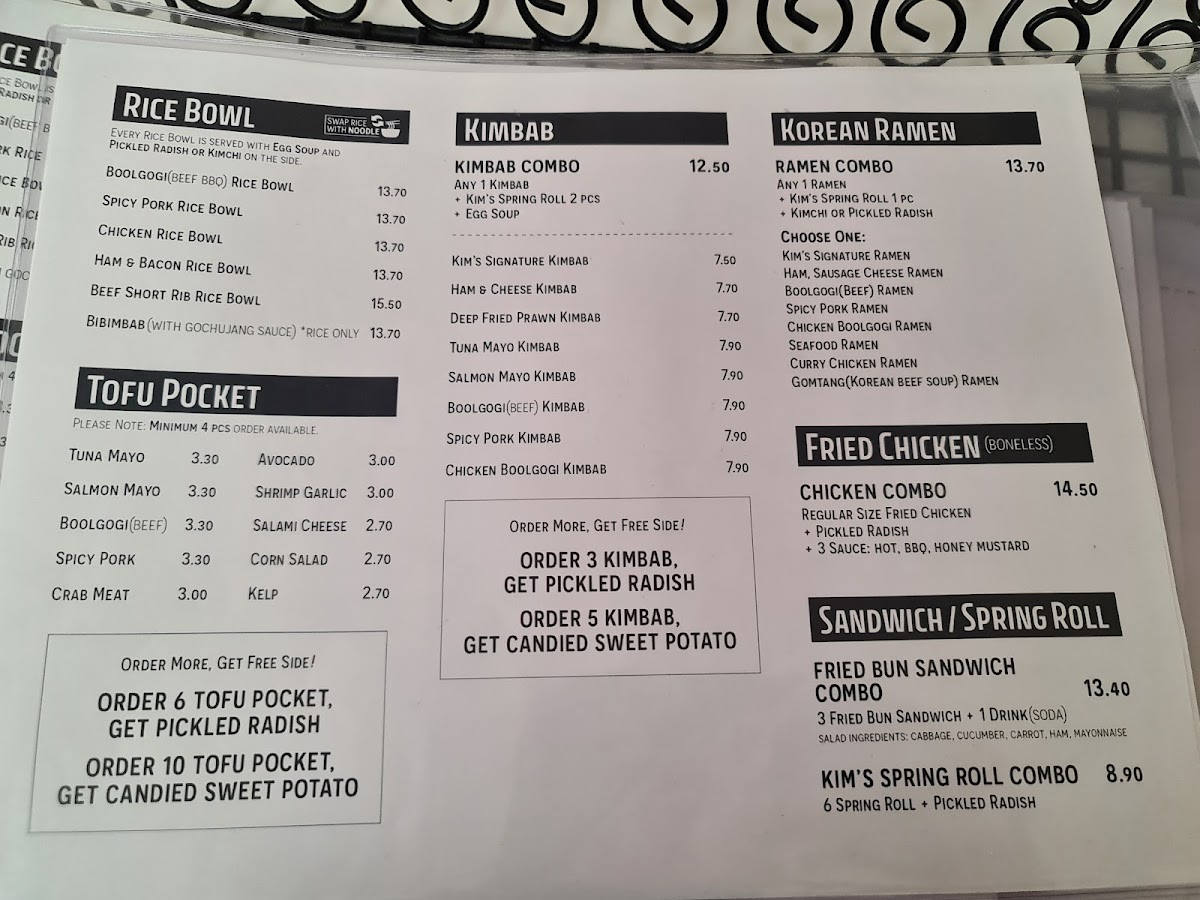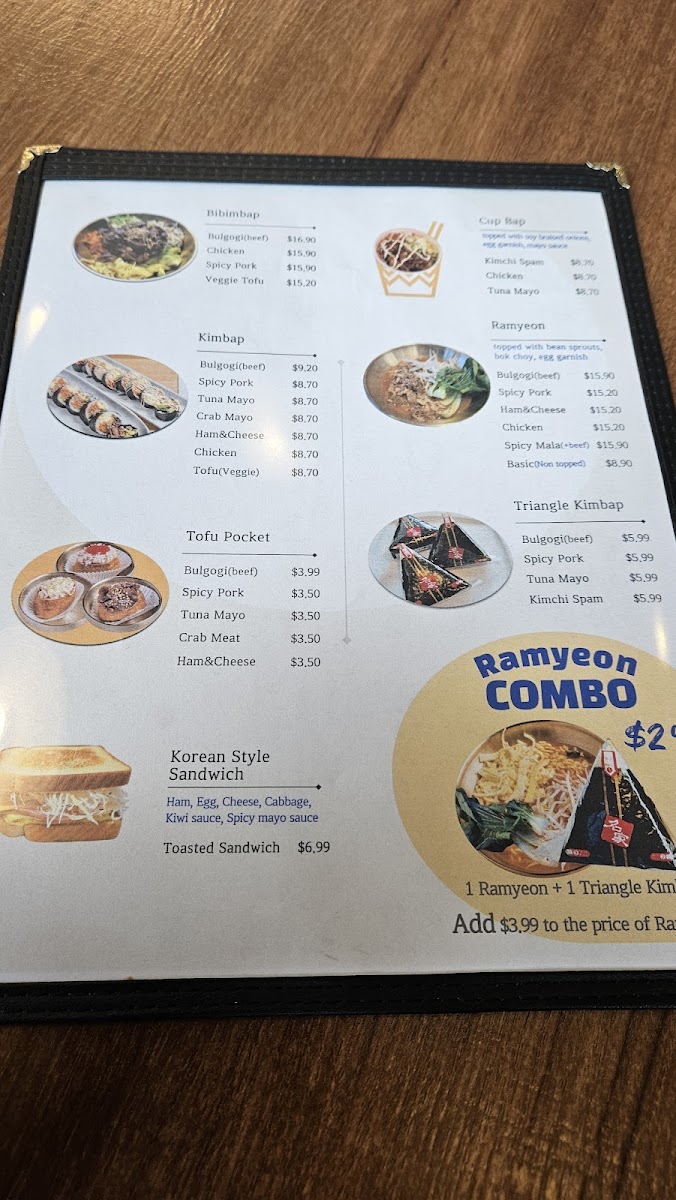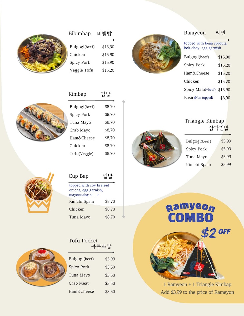 The menu showcases an array of hearty dishes that include their signature Kimbap, a simple yet flavorful roll crafted with fresh ingredients. Additionally, indulge in delicious Ramyeon varieties, such as the Bulgogi Ramyeon and Mala Ramyeon, all offered at reasonable prices. Don't miss the Cupbap selection, featuring favorites like Kimchi Spam Cupbap and Chicken Cupbap.